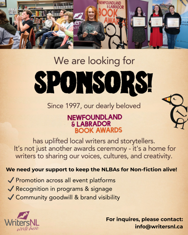 If the Newfoundland and Labrador Book Awards have touched your life in any way, or if you believe in the importance of supporting the arts, please consider becoming a sponsor or helping us spread the word.