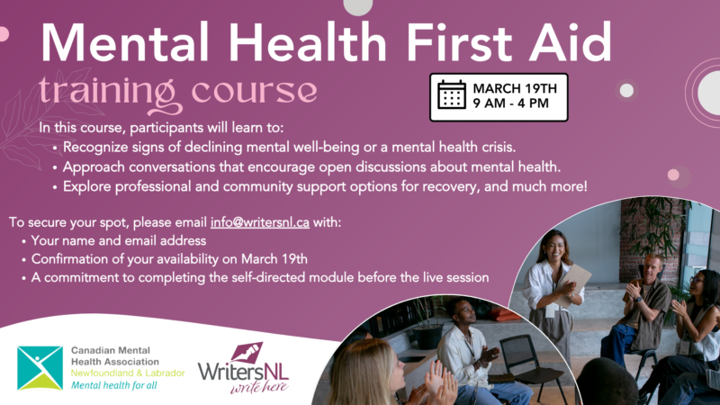 WritersNL, in partnership with the Canadian Mental Health Association (CMHA) Newfoundland and Labrador through the Community Lifelines Fund, is pleased to offer a limited number of our members the opportunity to participate in Mental Health First Aid (MHFA) training.