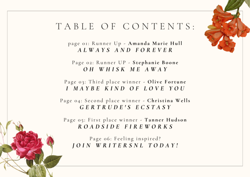 Writers of the top five selected submissions will take home the prizes below, and we’ll showcase the winning works via a special edition Valentine’s Day E-Zine + via an “audiobook” to be released on WritersNL’s YouTube.